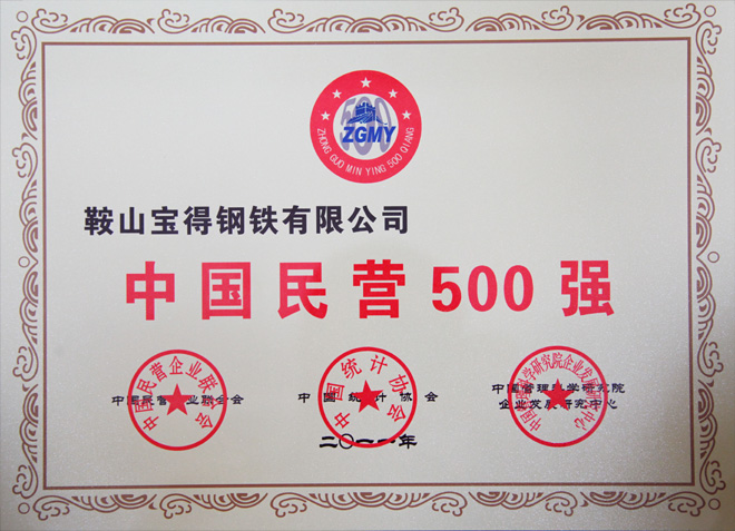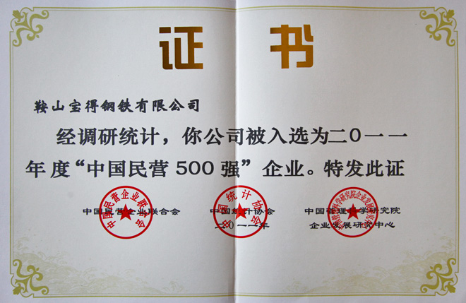 公司榮獲2011中國民營經(jīng)濟500強,排名第391位。遼寧省共12家企業(yè)入選。